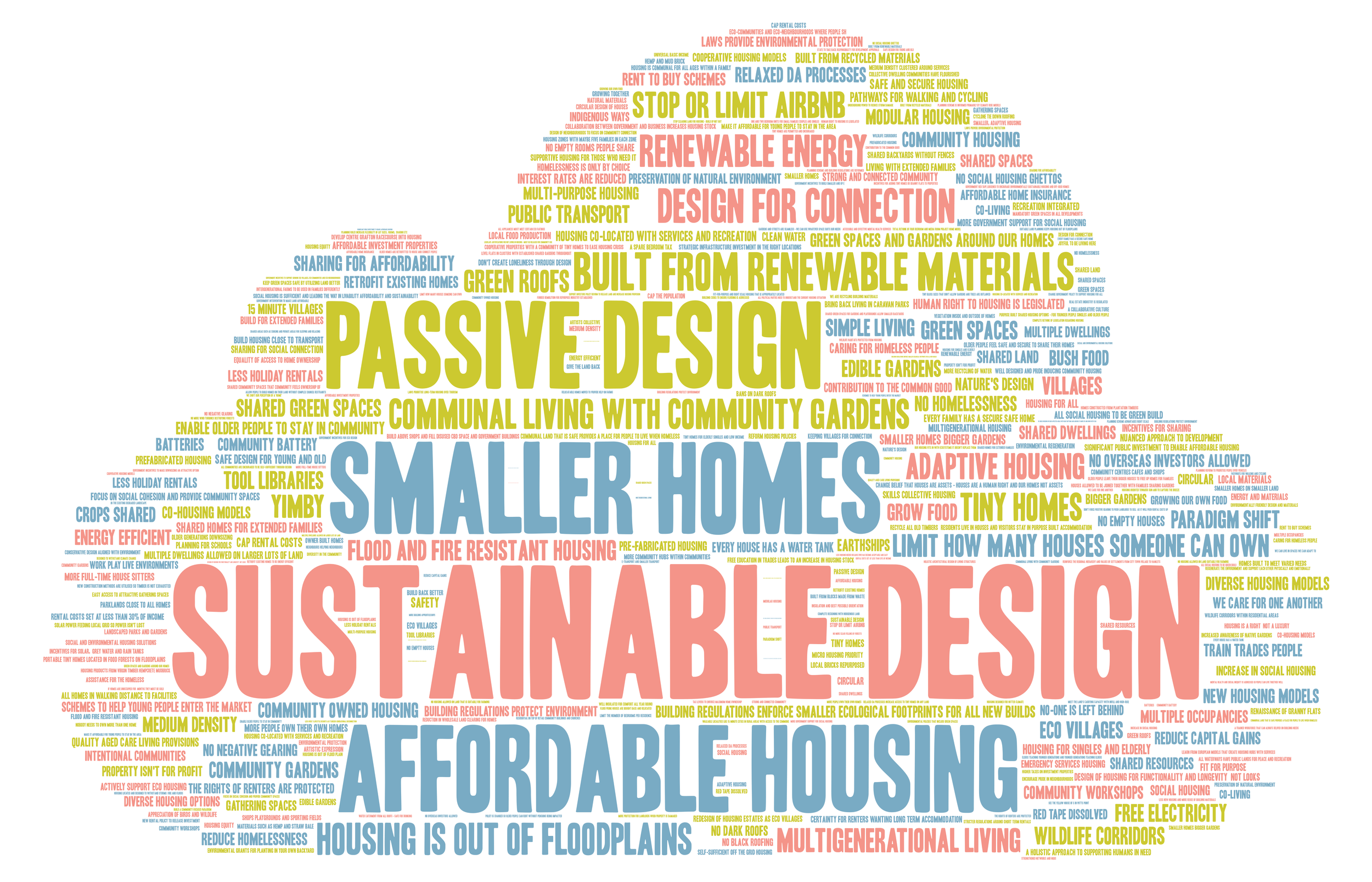 Participants generated 797 responses to this prompt: Imagine… It’s 2040 and a child born today is turning 15 years old. In response to the housing crisis of the 2020’s, a massive collaboration between government, business and community has led to an extra 21,000 homes becoming available across the Northern Rivers. What does our child’s home, garden and community look and feel like? How have we balanced rapid construction of housing with the need to protect our natural environment? What policy shifts have enabled everyone to have access to safe and affordable homes with low environmental impact?